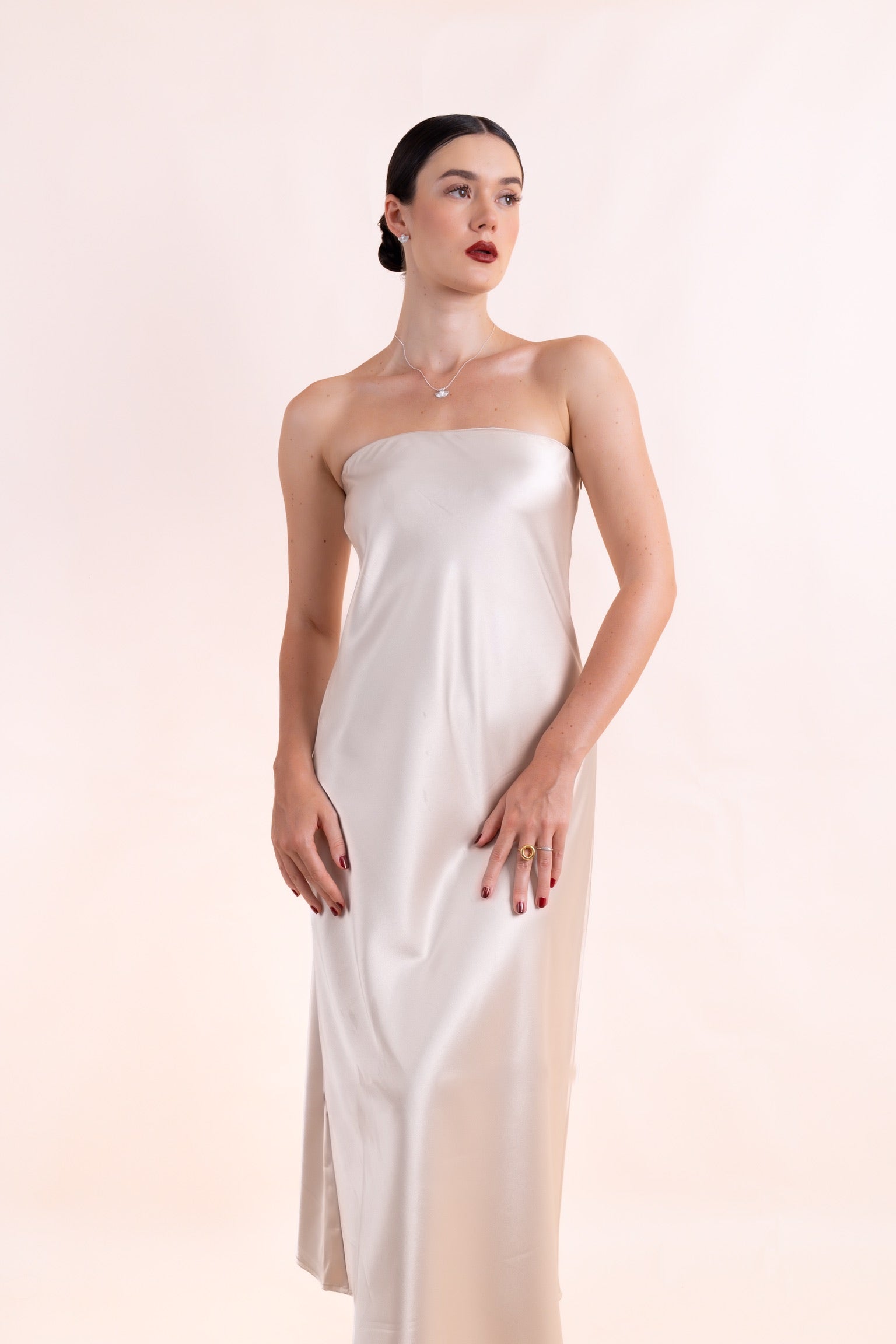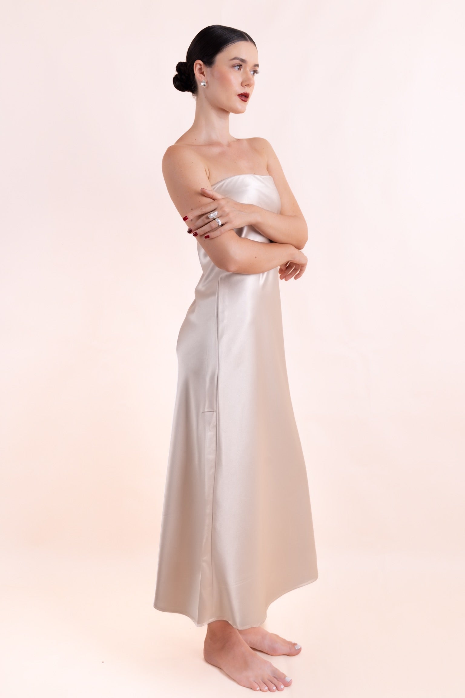 This timeless gown is crafted from 100% thick, luxurious Vietnamese silk, offering a soft yet structured silhouette that drapes beautifully. Designed for versatility, it transitions seamlessly from day to evening—pair it with a denim jacket for a casual day out or wear it solo for a refined, graceful statement at galas, dinners, or special events.